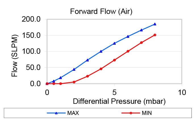 Flow and differential pressure are measured simultaneously as the inlet pressure increases from zero. Once the maximum flow is reached, the pressure is gradually reduced back to zero, with flow and differential pressure measured throughout the process. The chart displays the minimum and maximum flow values recorded during tests of multiple samples at each pressure level. Water test data is available upon request.