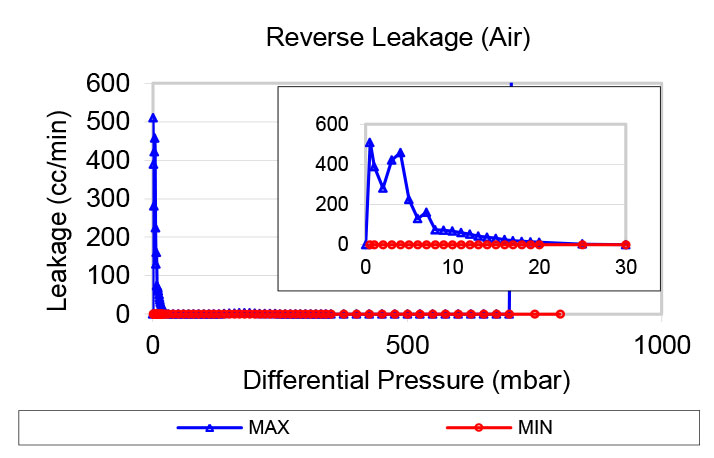 Leakage, or reverse flow, is measured by gradually increasing the backpressure across the valve, starting from zero. Please note that the leakage graph uses a different scale compared to the flow graphs. Water test data is available upon request.